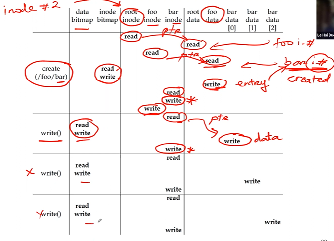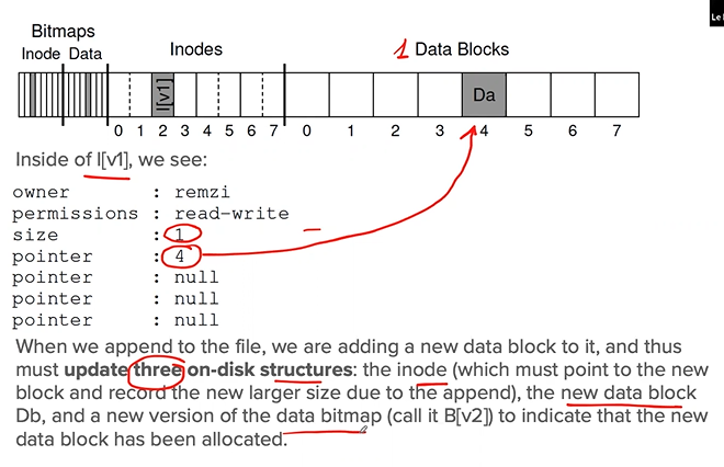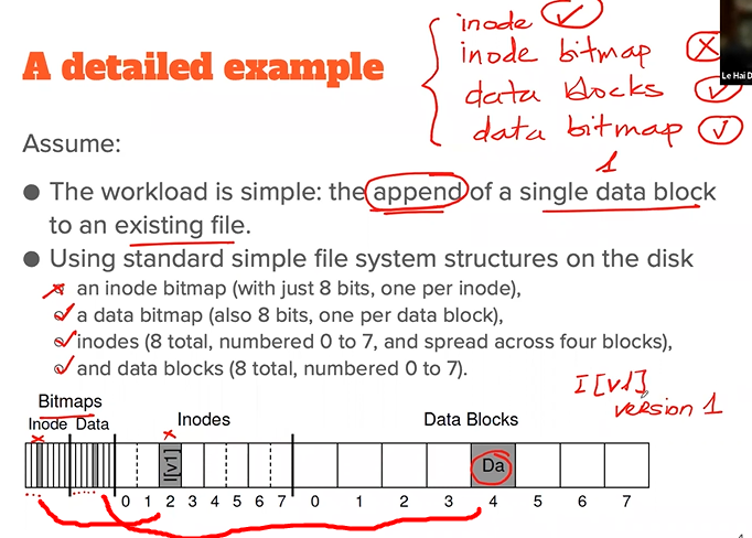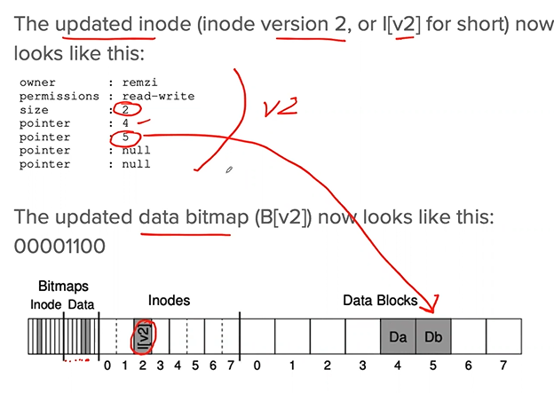 1. The inode and the bitmap are written: consistency metadata but there is garbage